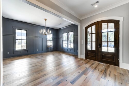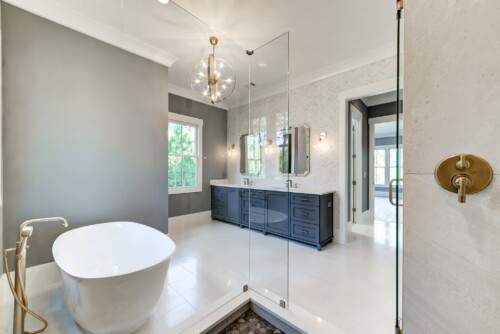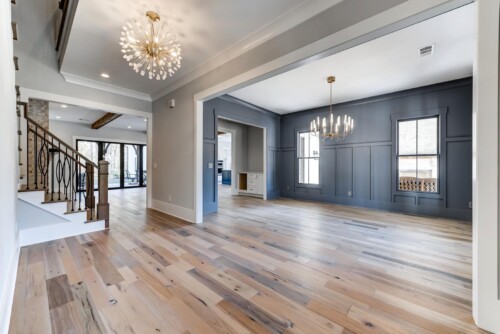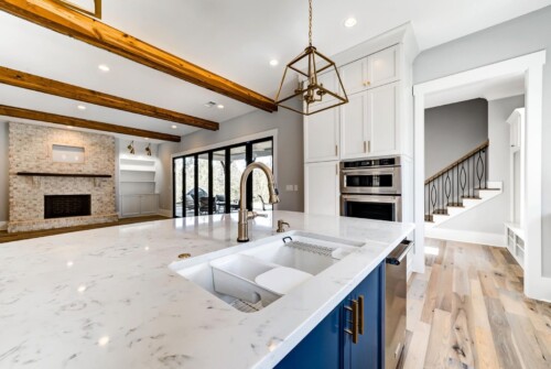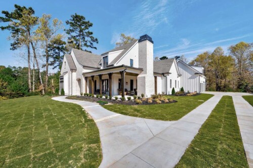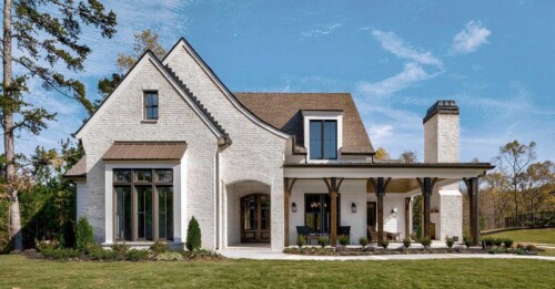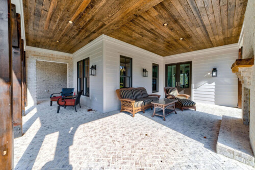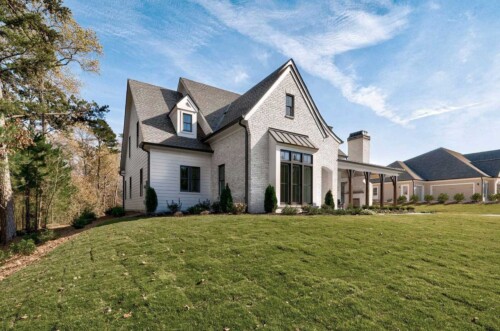 This Southern Living new construction home with details and finishes designed by Hayes House, beautifully combines country charm with coastal and rustic accents on the shores of Lake Lanier. The gingerbread-style exterior, featuring intricate woodwork and warm brick details, exudes timeless elegance with a front porch fireplace that creates an inviting atmosphere. Inside, exposed wood beams from a historic Tennessee barn add cozy warmth, while large sliding windows provide an indoor-outdoor living experience . The seamless blend of coastal and traditional elements offers a serene, lakeside retreat perfect for both relaxation and entertaining.