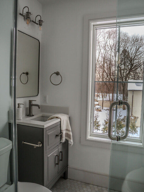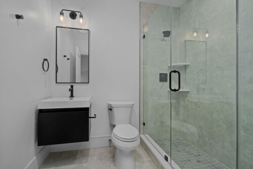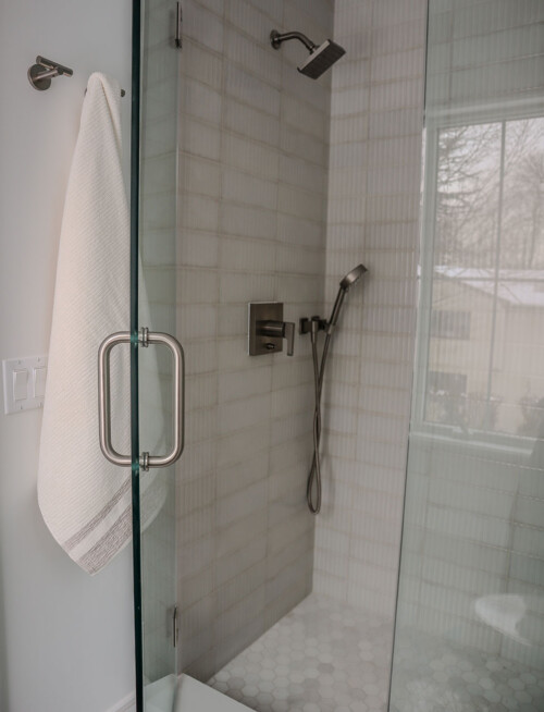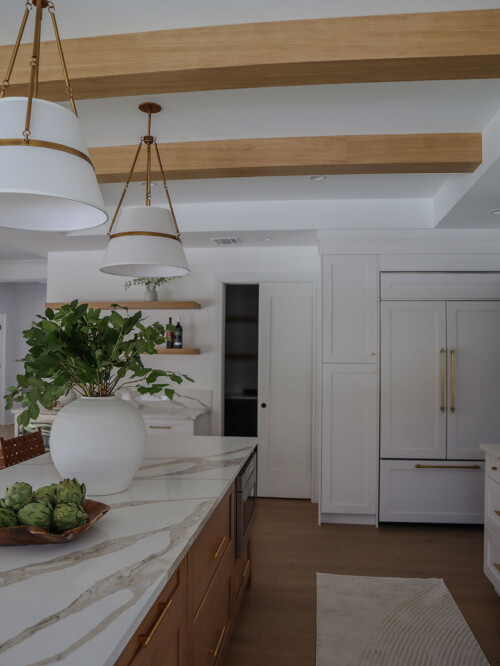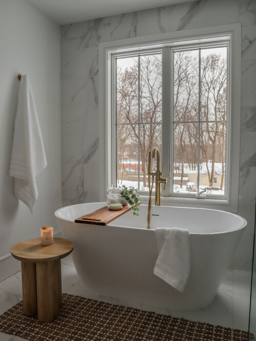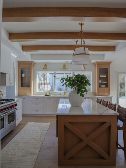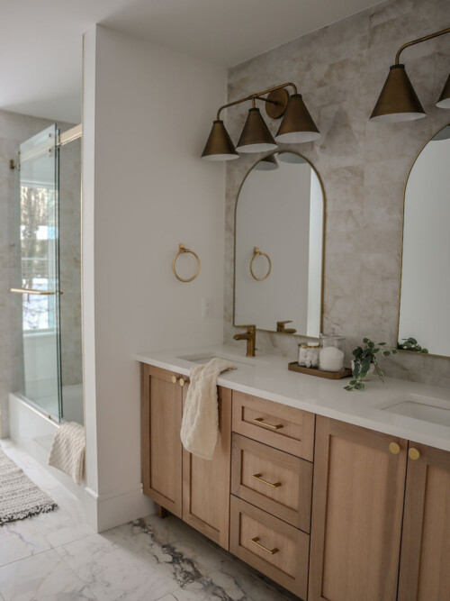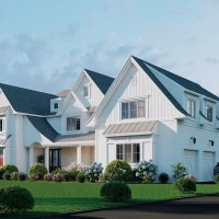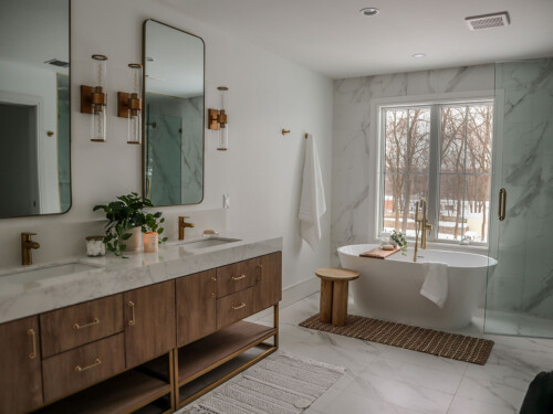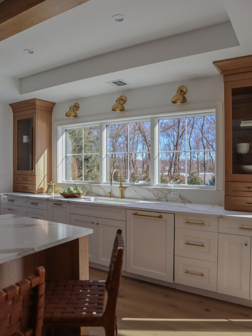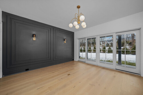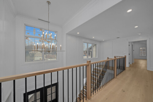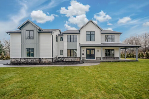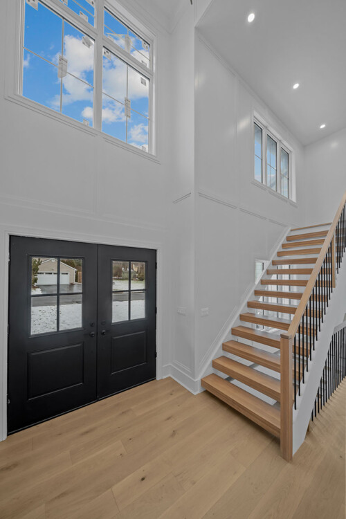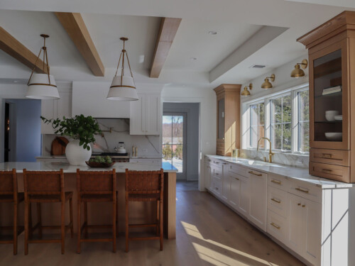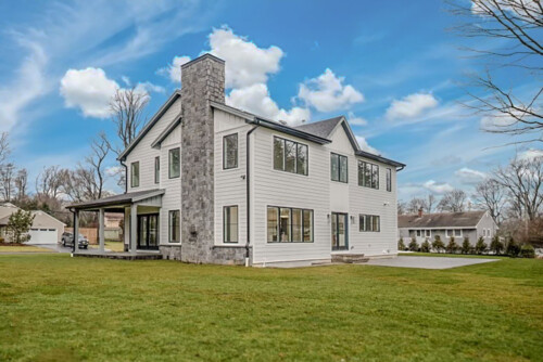 Located outside New York City, this new construction, transitional classic home, designed by Hayes House, combines timeless finishes with lasting details. The home features a pristine white interior with an open layout, white oak accents, blending seamlessly into the surrounding area.. The primary suite offers a spacious retreat with a luxurious bathroom, completing this sophisticated, yet inviting home.